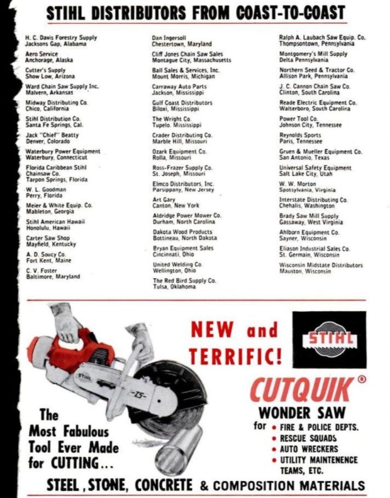 Next, a list of STIHL DISTRIBUTORS FROM COAST-TO-COAST alongside an ad for the STIHL Cutquik Wonder Saw.