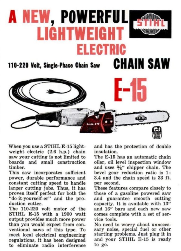 E-15When you use a STIHL E-15 lightweight electric (2.6 h.p.) chain saw your cutting is not limited to boards and small construction timber.