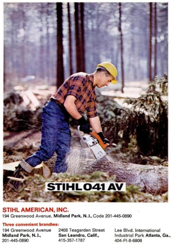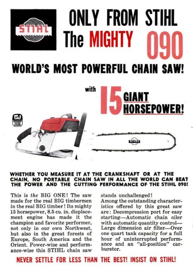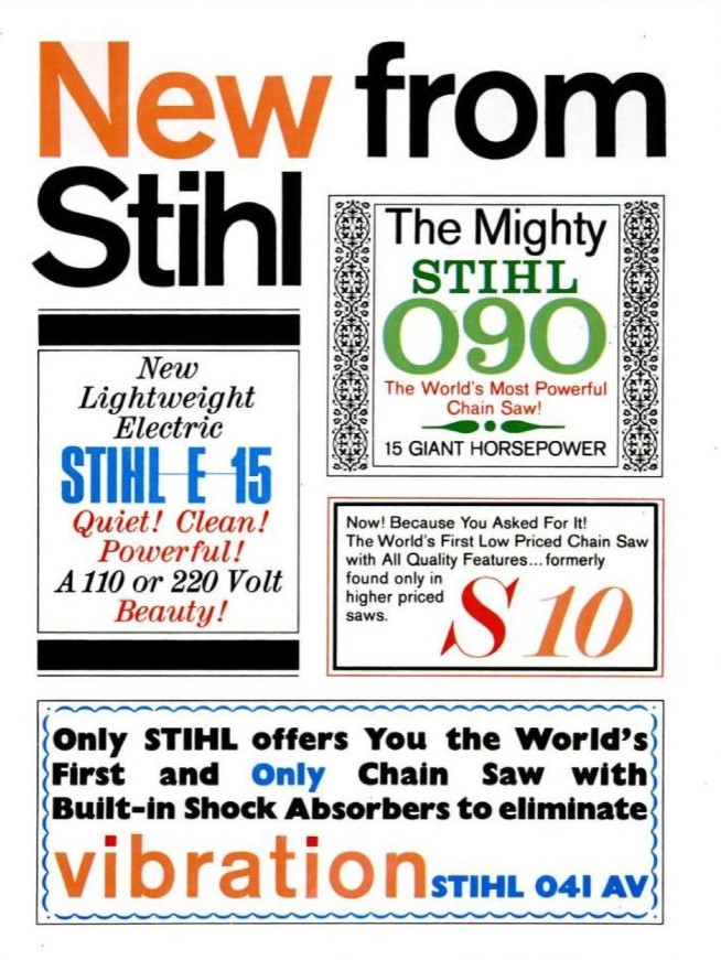 It’s interesting and noteworthy because I haven’t found a series of chainsaw ads, one after another like this, anywhere else. It has a cover page followed by ads for the 041 AV (with an explanation of the new AV feature), the now-rare STIHL S-10 top-handle version, a list of STIHL distributors in the SUA, the Mighty STIHL 090, and then the powerful electric STIHL E-15 Chainsaw.